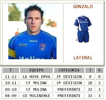 Fichaje de lujo en la vuelta del Kaiser Gonzalo al Sánchez Cánovas, jugador que se gano la admiración y el respeto de la parroquía molinense por su rendimiento y entrega en el terreno de juego, es además un jugador de equipo y de vestuario. El pasado verano ficharia por el todopoderoso La Hoya sin embargo una lesión en pretemporada le impediría triunfar. A pesar de estar recuperado desde el pasado mes de Febrero no llegaría a debutar en liga al no tener ficha, amplia experiencia en la categoría tras militar en las filas de Horadada, Lorqui y Totana entre otros. Aterriza en Molina de Segura en el verano del 2.008 para incorporarse a la útima temporada del Cd.Molinense y primeras del Cf.Molina lo que le hace entrar en nuestra historia.